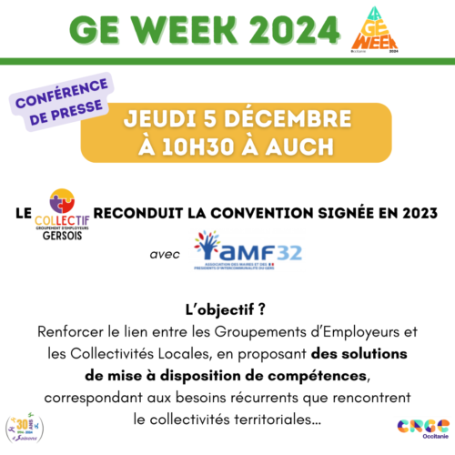 GE Week 2024 - Signature de deux conventions de partenariat entre le collectif des GE gersois (GEAG 32, GE 4 Saisons, GEGG), le Gers recrute et l'AMF 32.