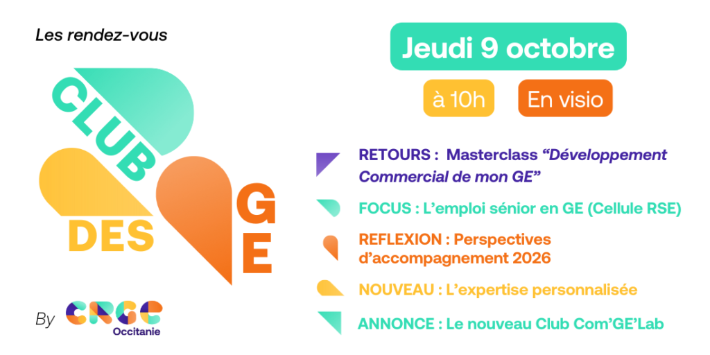 Retrouvons-nous à l’occasion du prochain club des GE, le jeudi 9 octobre, à partir de 10h, en visioconférence. Retours sur la masterclass, focus sur l'emploi des séniors en GE, réflexion sur les perspectives d'accompagnement 2026, ...