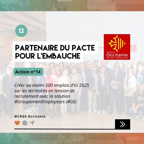 - Le CRGE Occitanie, partenaire du Pacte pour l’embauche de la Région Occitanie – Action N°14 : Créer au moins 500 emplois d’ici 2025 sur les territoires en tension de recrutement avec la solution Groupement d’Employeurs