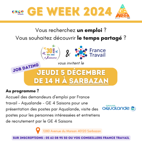 Participez au Jobdating organisé par le GE 4 Saisons ! Vous serez accueillis par France Travail, Aqualande et le GE 4 Saisons, pour une présentation des postes à pourvoir, une visite des postes pour les personnes intéressées et des entretiens pour les plus motivés !